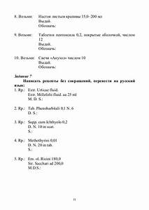 На рецептурных бланках часто используют следующие латинские сокращения, они представлены в таблице ниже с переводом на русский. Названия лекарственных веществ пишут в родительном падеже. Например, Rр.: Atenololi 0,05 - Возьми 50 мг атенолола. Общая структура рецепта всегда включает в себя три колонки Rp. Справа от названия вещества (по правому краю рецепта) указывают его количество. Для жидких веществ количества обозначаются в миллилитрах, граммах или каплях; для остальных веществ - в граммах и долях грамма.